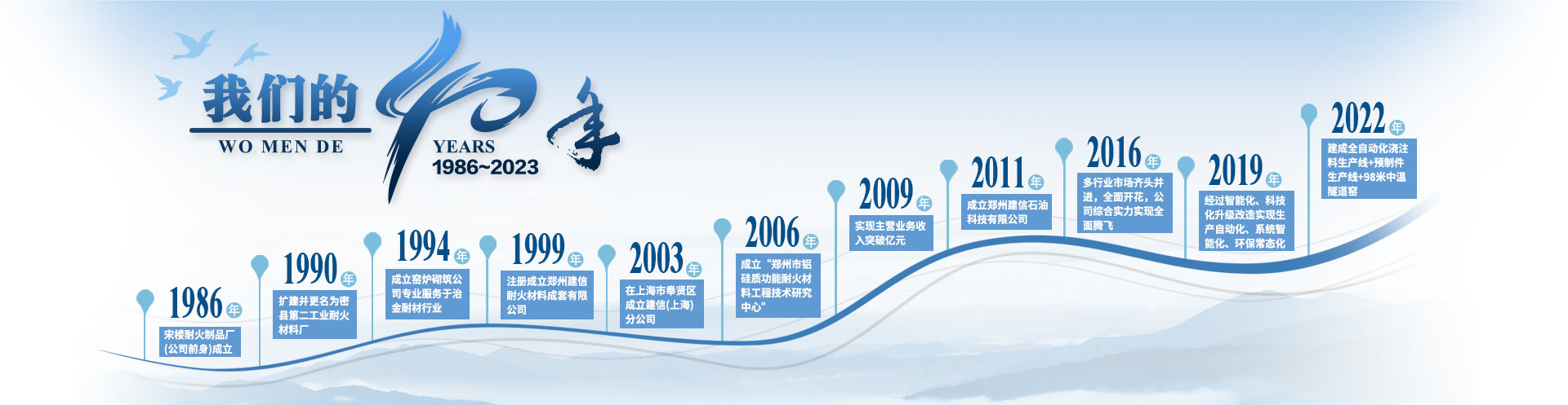 鄭州建信耐火材料成套有限公司總部位于耐材之鄉-河南省新密市,是一家集耐材產品研發、生產、銷售、施工為一體的高新技術企業。公司現有員工350人。鄭州建信耐材下設三個生產分廠,一個專業窯爐砌筑工程公司,構建為全方位的一體化架構體系,為炭素行業,建材行業,鋼鐵行業,有色金屬冶煉行業和環保危廢行業提供涵蓋整套耐火材料設計和生產、現場施工砌筑及后期維護的專業服務。建信耐材先后參與起草國家建材及行業標準:《高鋁抗剝落磚、系列耐堿磚及系列硅莫磚》、《水泥回轉窯協同處置用耐火材料抗侵蝕實驗方法》、《耐火材料及砌筑使用規程》和《石灰窯砌筑技術條件》。近年來先后榮獲“國家科技型企業”、“高新技術企業”、“河南省綠色工廠”、河南省“專精特新”企業、“環保績效A級”企業、“河南省著名商標”、“市長質量獎”等殊榮......